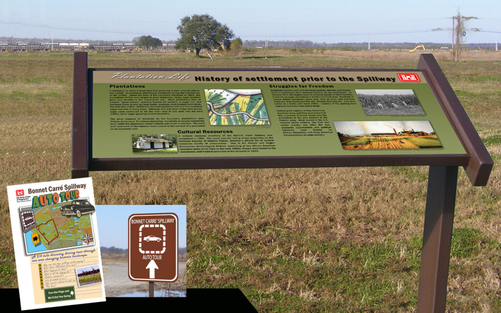 The U.S. Army Corp of Engineer Bonnet Carre’ Spillway site is a 7,400 acre site along the Mississippi River. Long ago the site was slave settlement and sugar plantation. Today visitors can tour the site along a pedestrian trail or in their vehicles with the aid of a interpretive auto tour program.